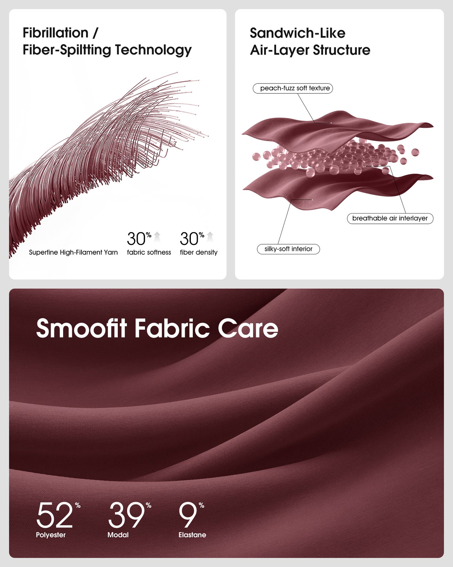 • SMOOFIT fabric has an air-layered design for a plush, peach-fuzz feel. Its advanced fiber-splitting technology ensures superior softness, wrinkle resistance, elasticity, and a graceful drape.