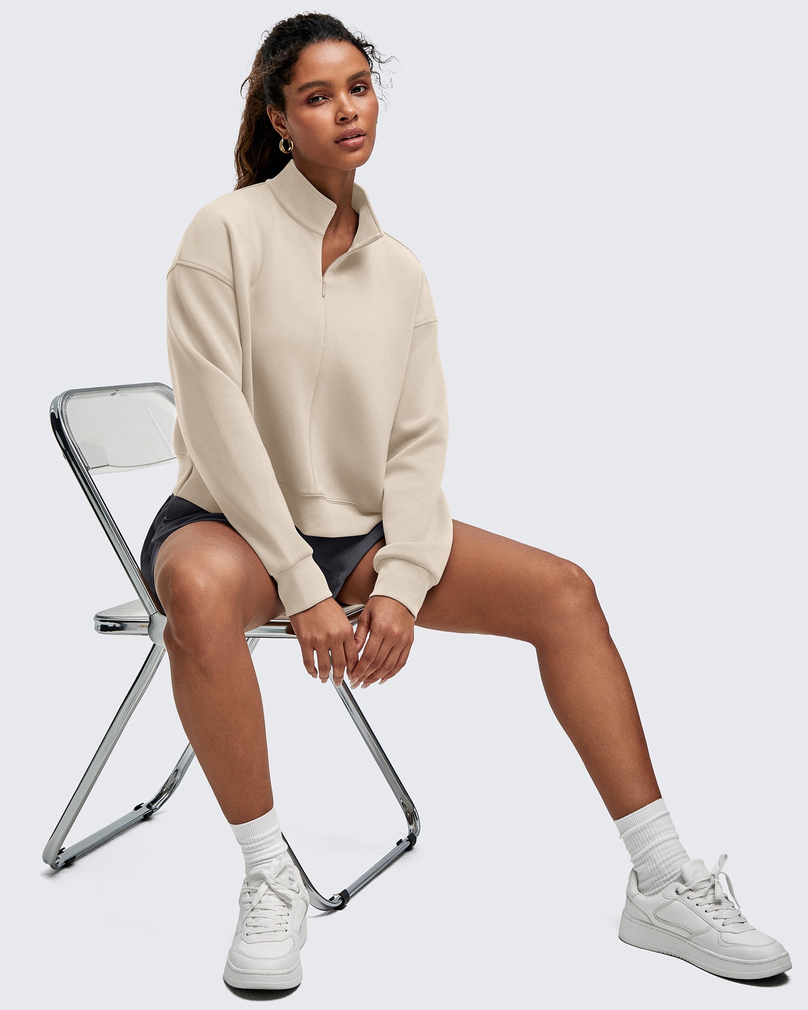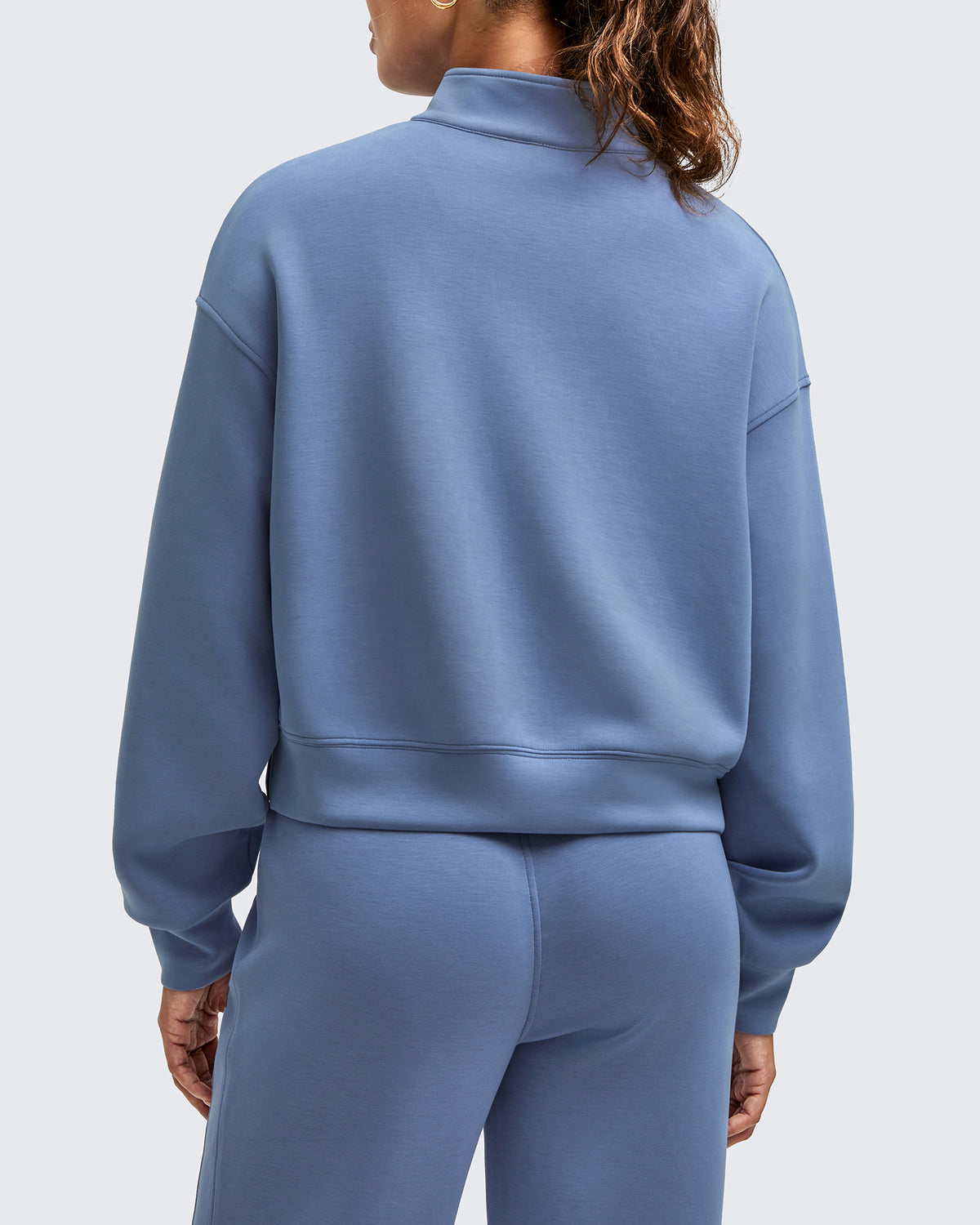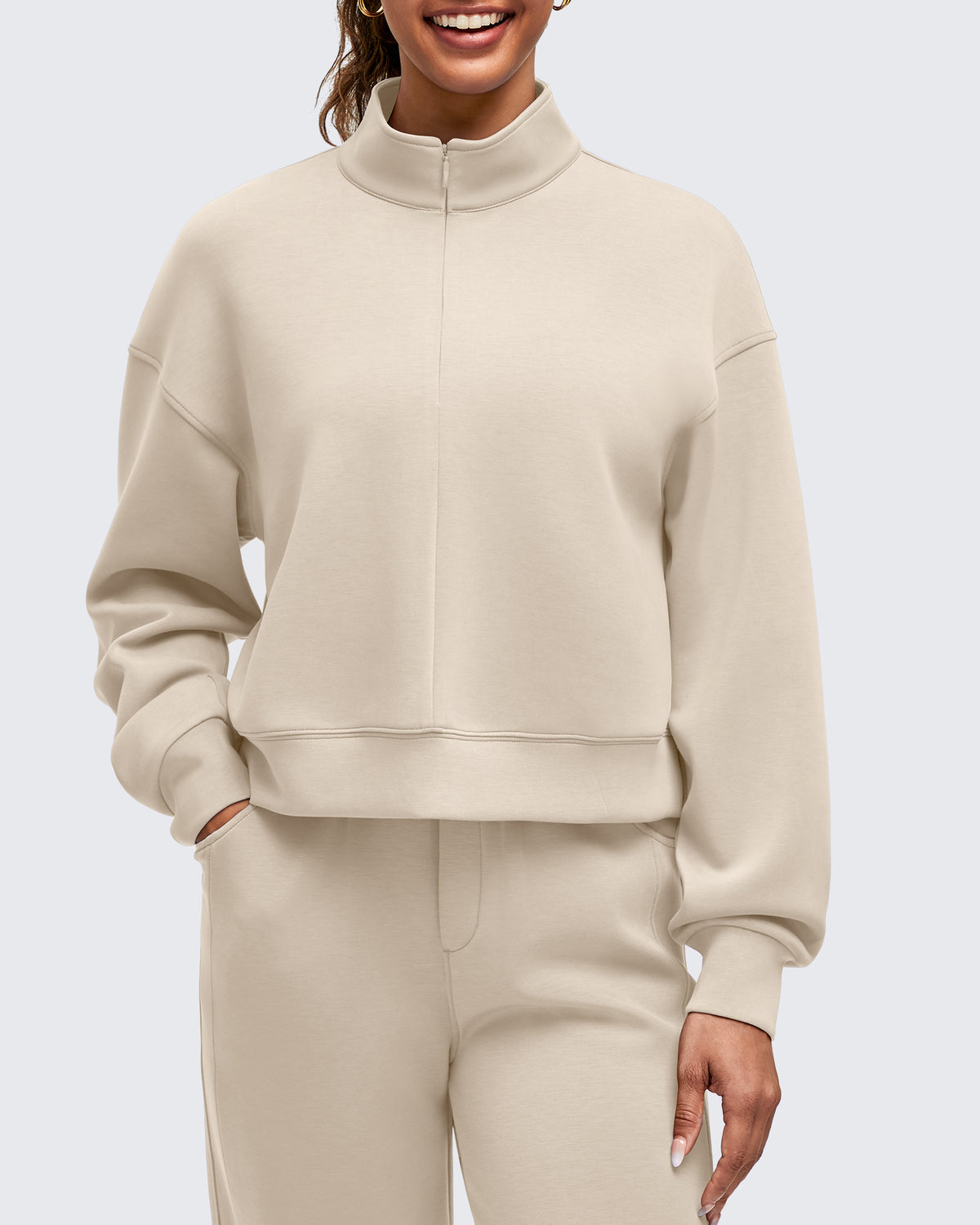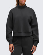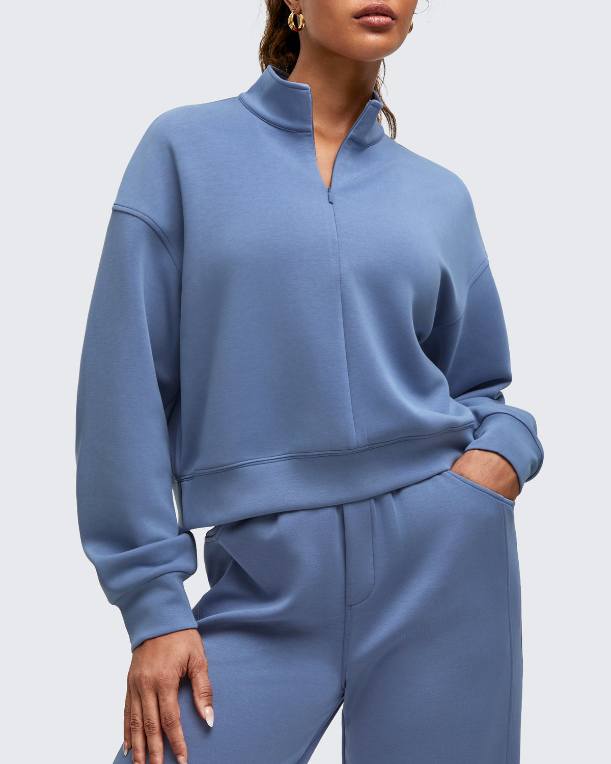 • Waist length half-zip sweatshirt with a stand collar, dropped shoulders, and side splits for easy layering for a relaxed yet chic look