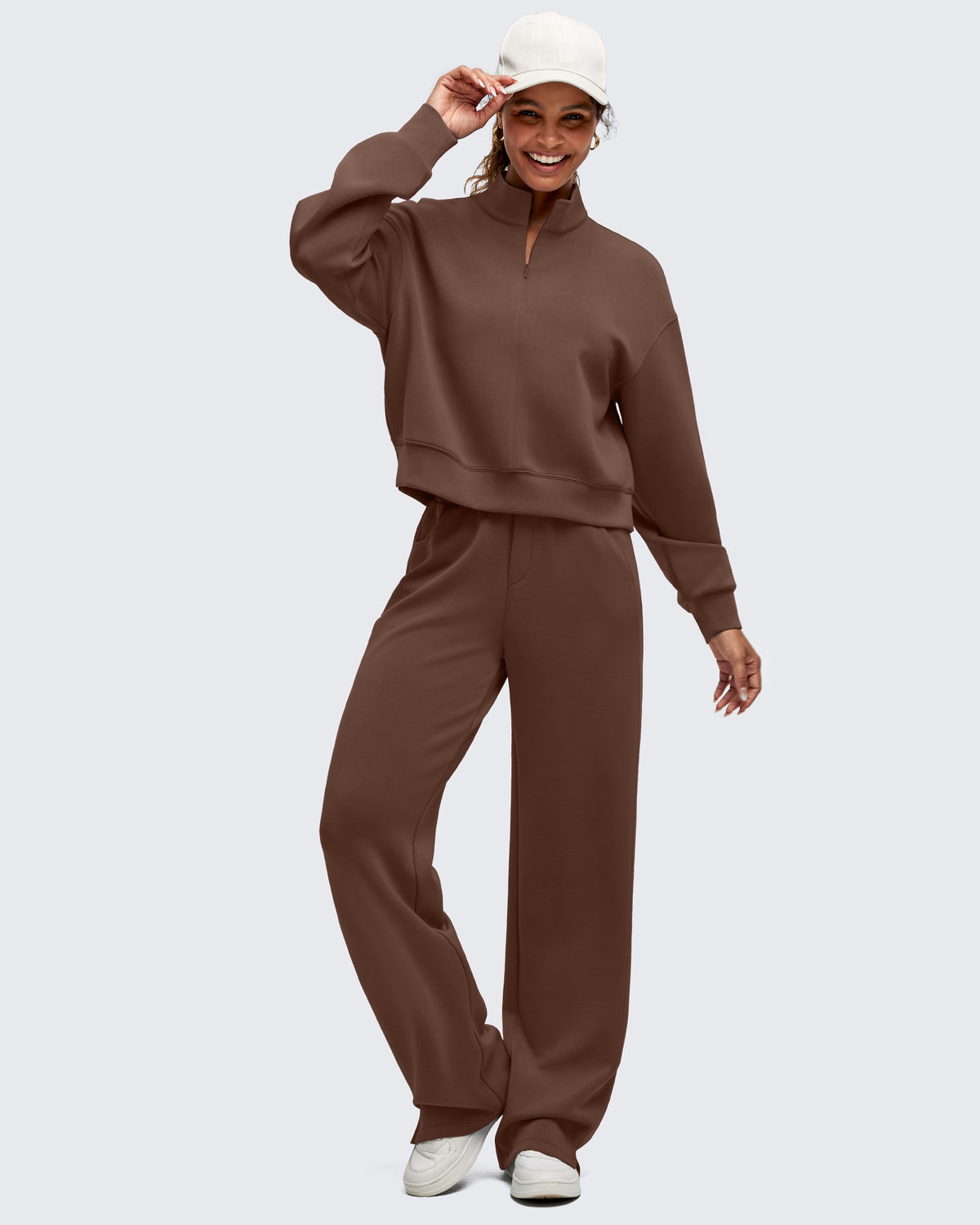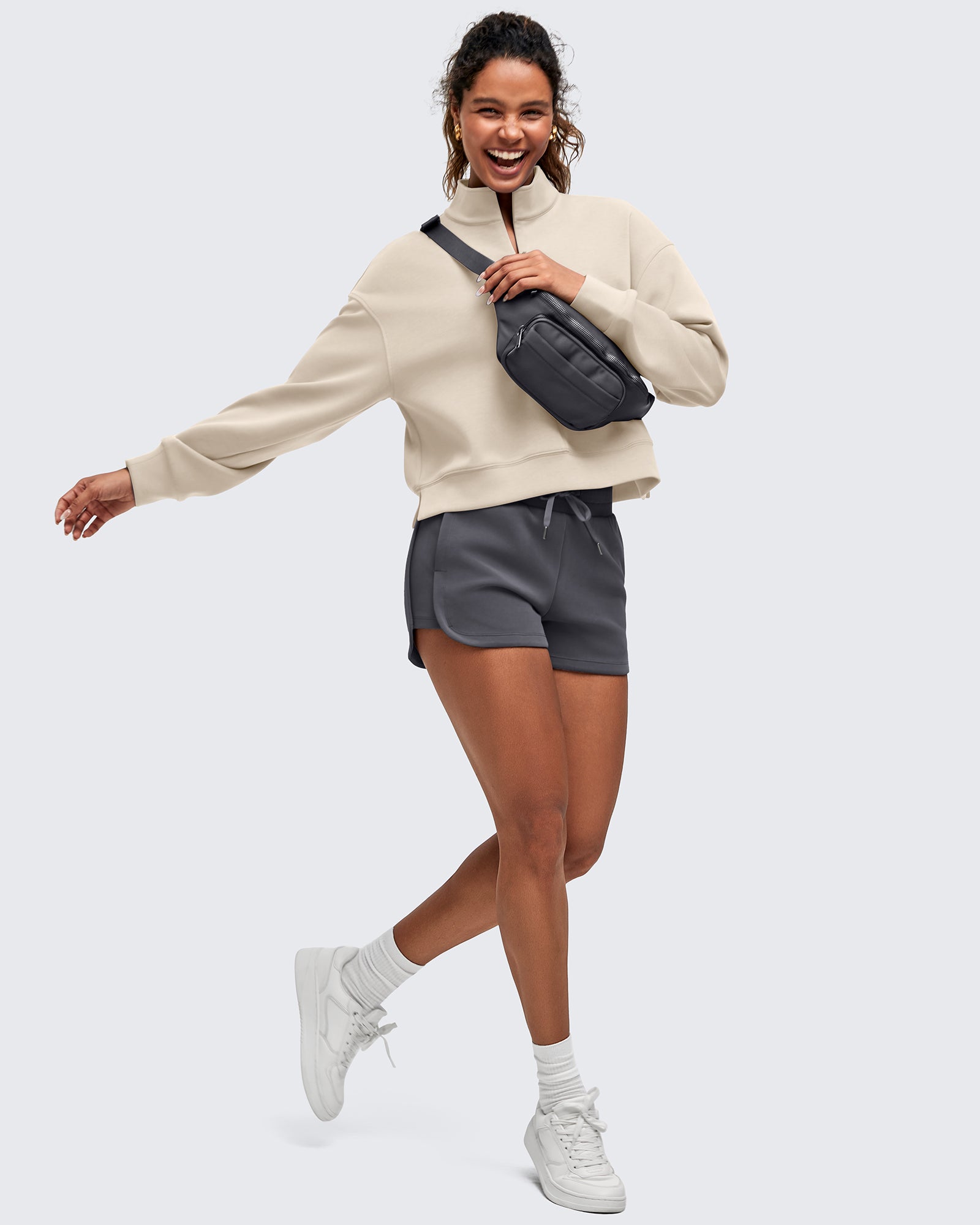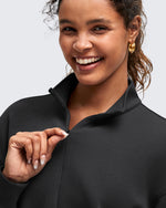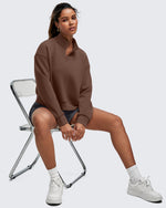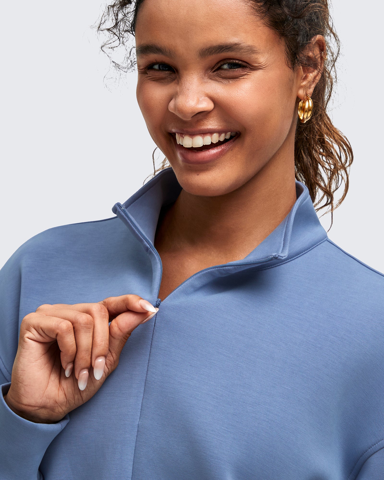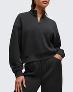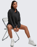 • Waist length half-zip sweatshirt with a stand collar, dropped shoulders, and side splits for easy layering for a relaxed yet chic look